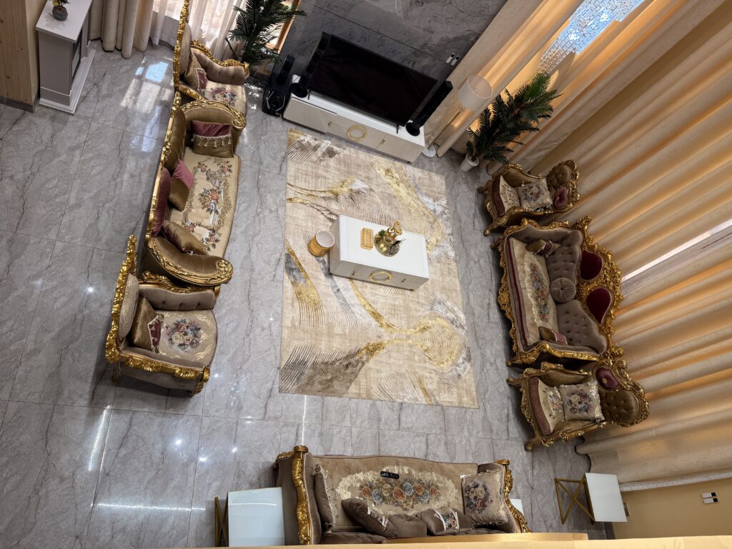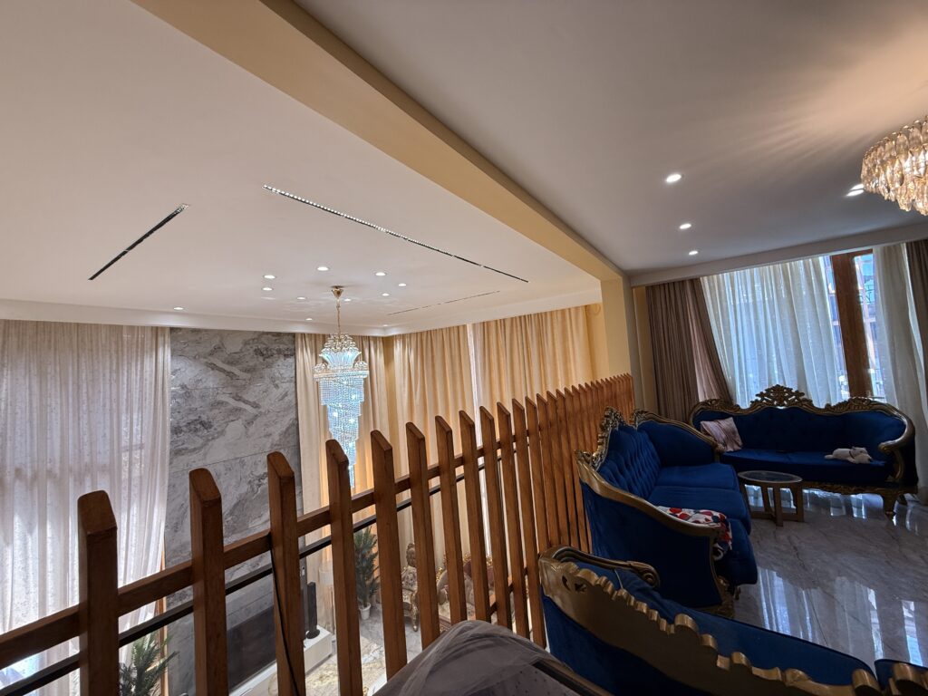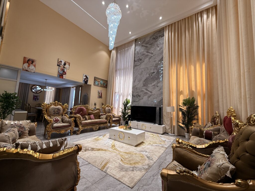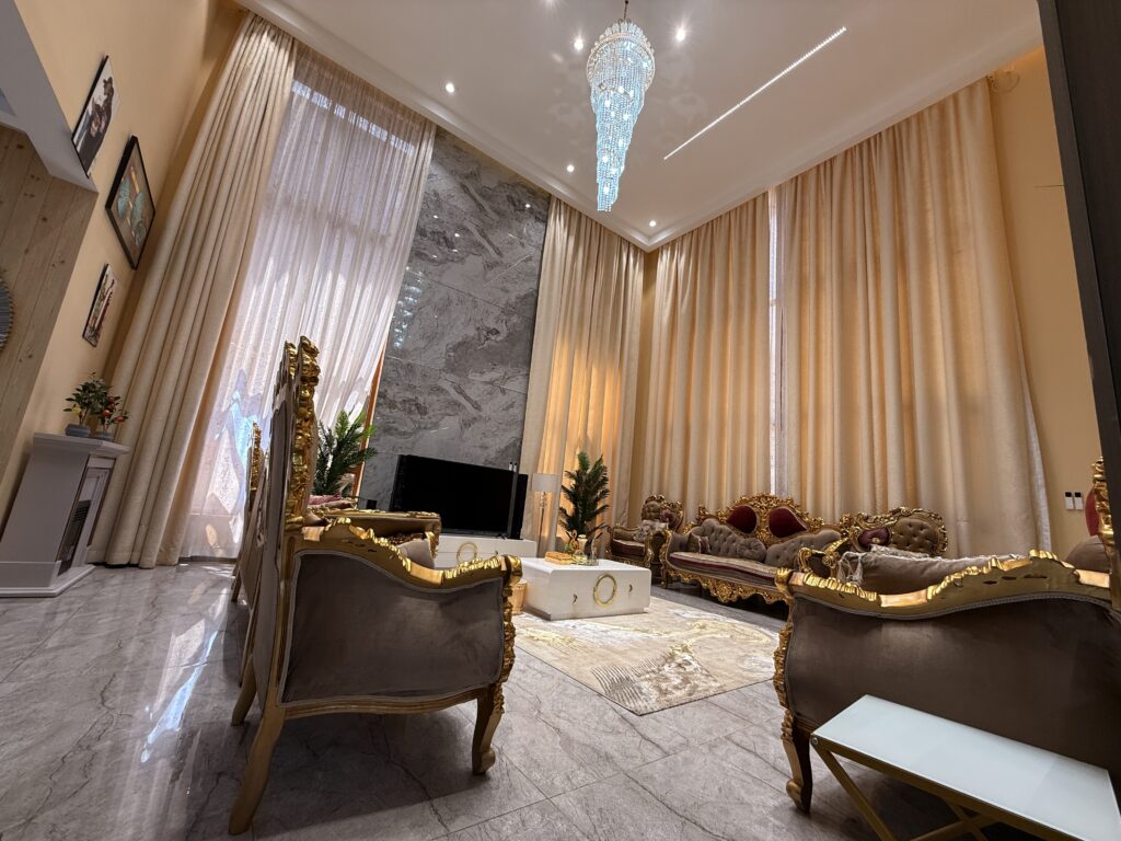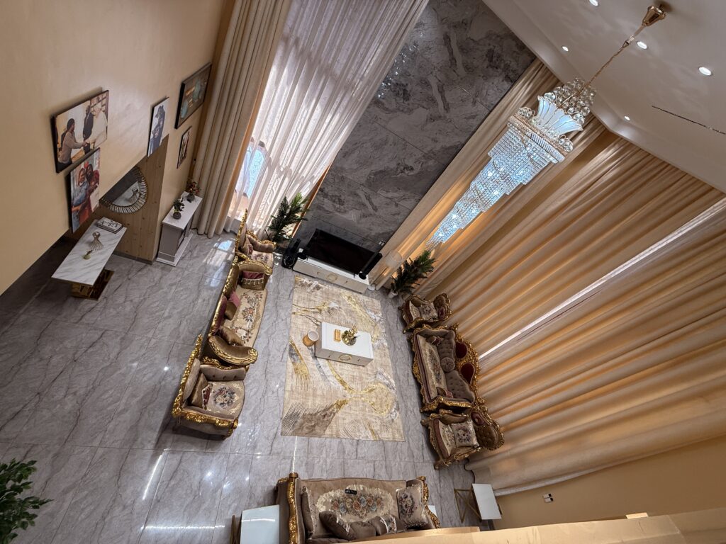 The grand lounge features a double-volume ceiling and “smart” automatic curtains, seamlessly blending modern tech with high-end architectural design. 🛋️✨